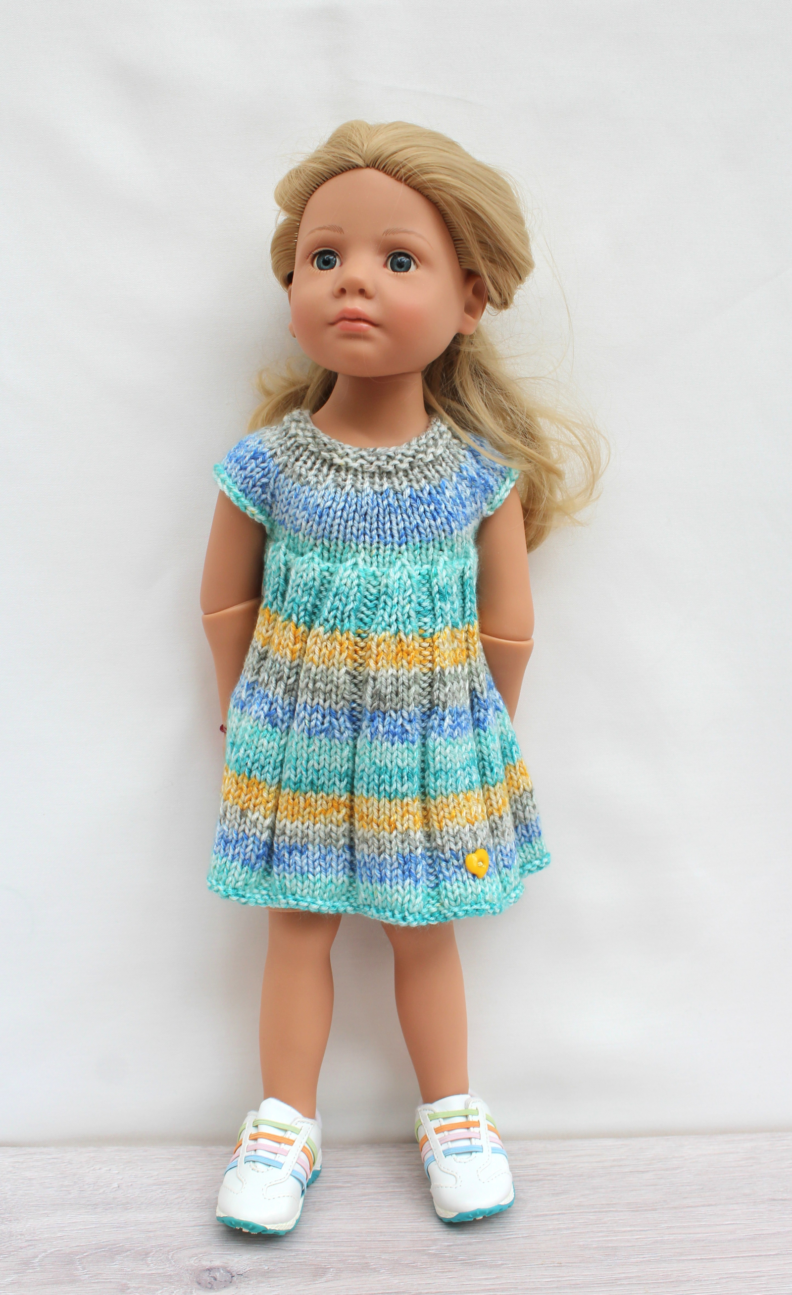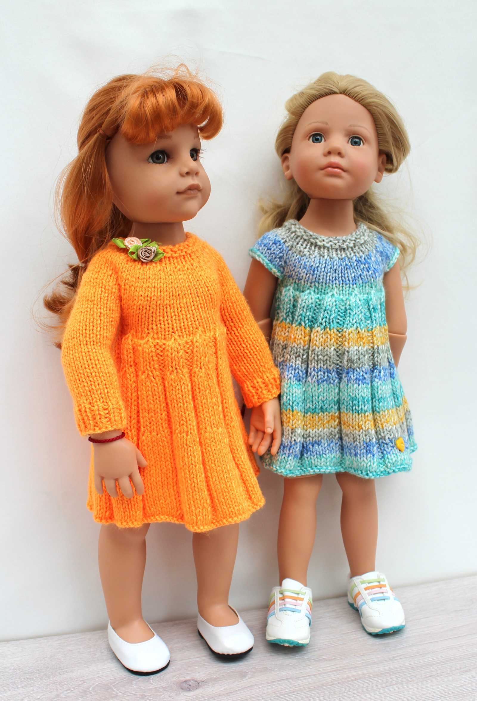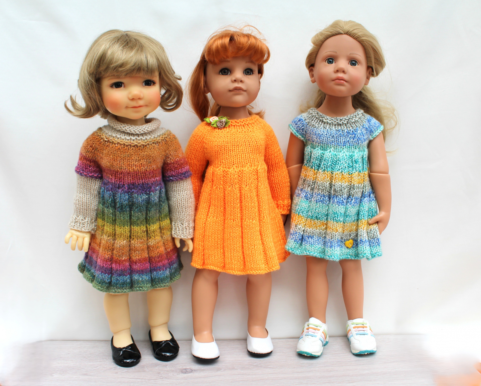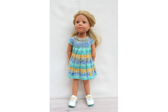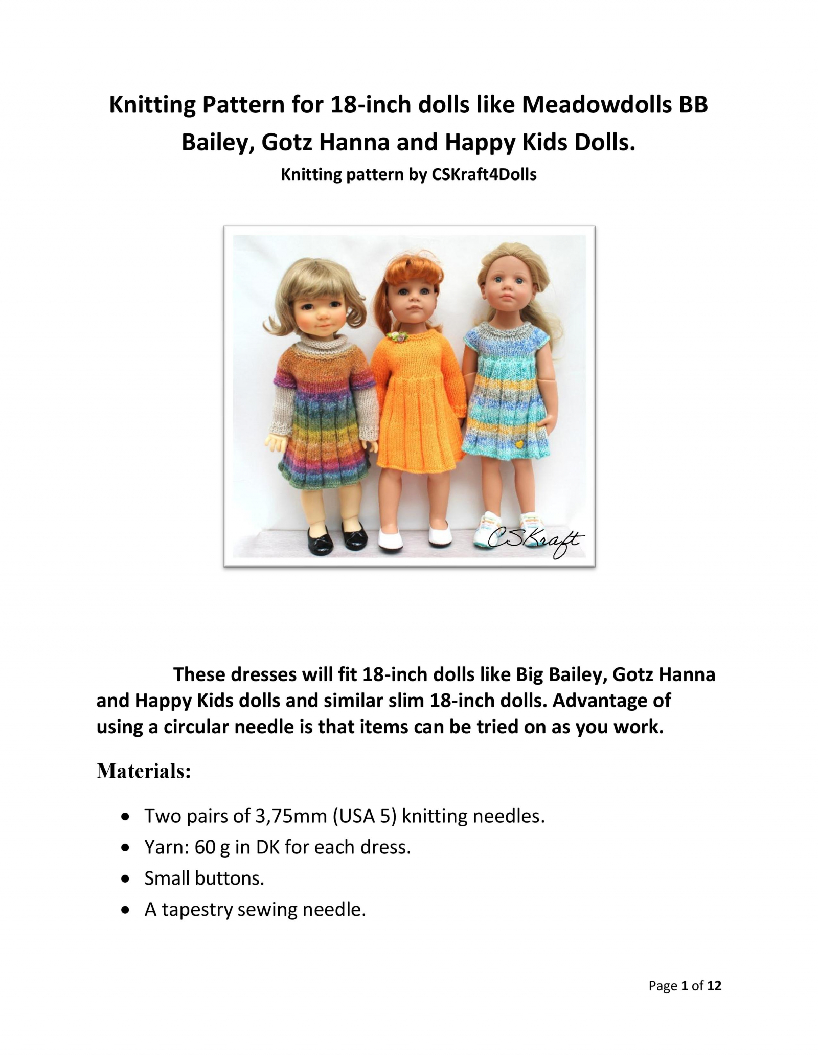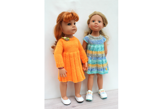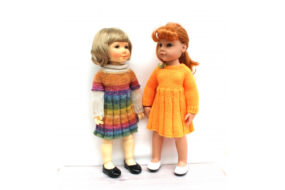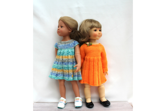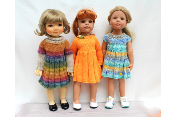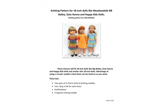 This knitting pattern includes 12 pages of row by row instruction for knitting three cute dresses for 18-inch slim dolls like Meadowdolls Big Bailey, Gotz Hanna, Happy Kids dolls and Journey Girls
