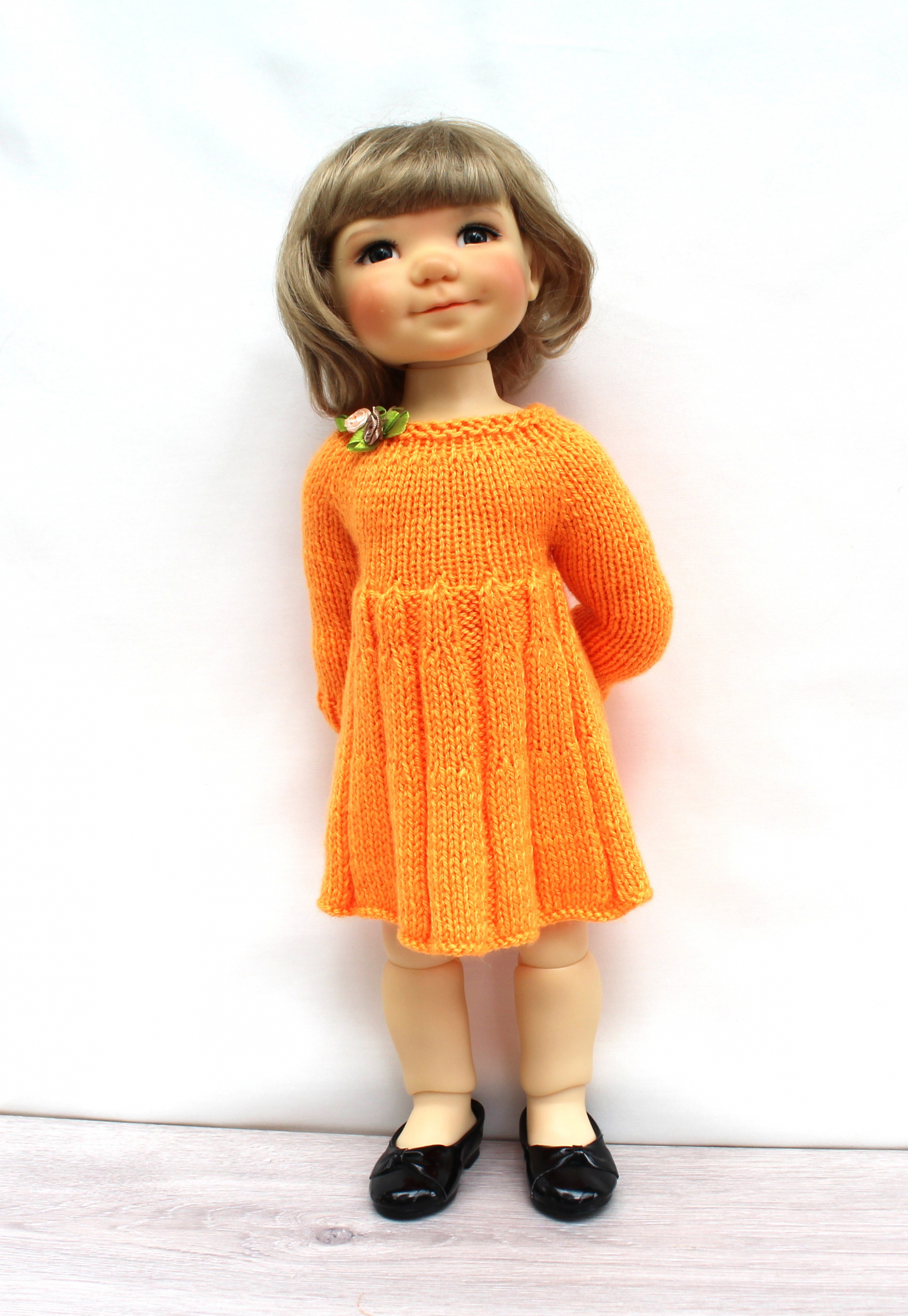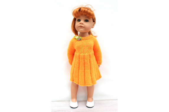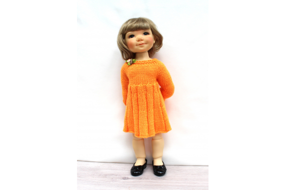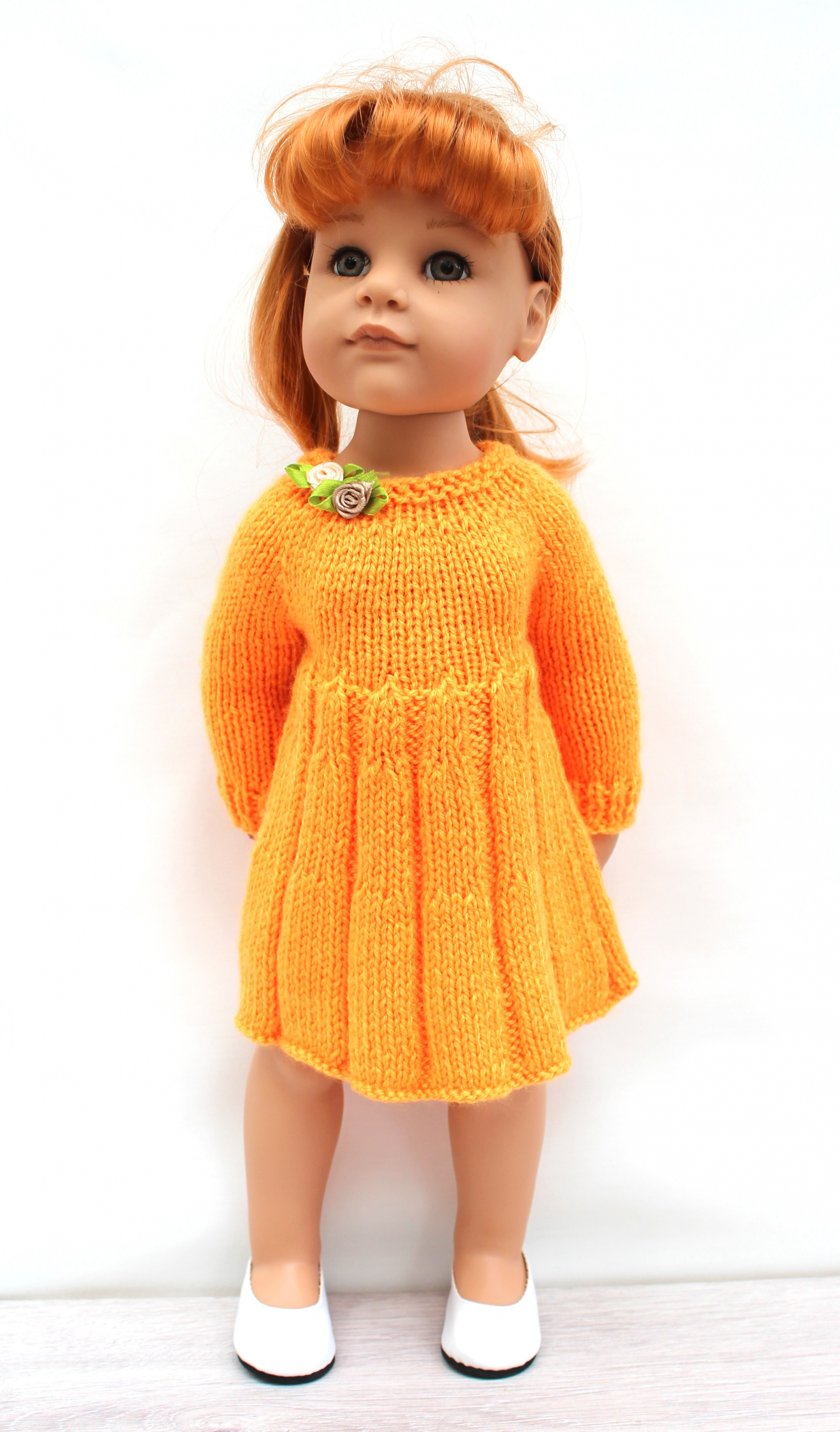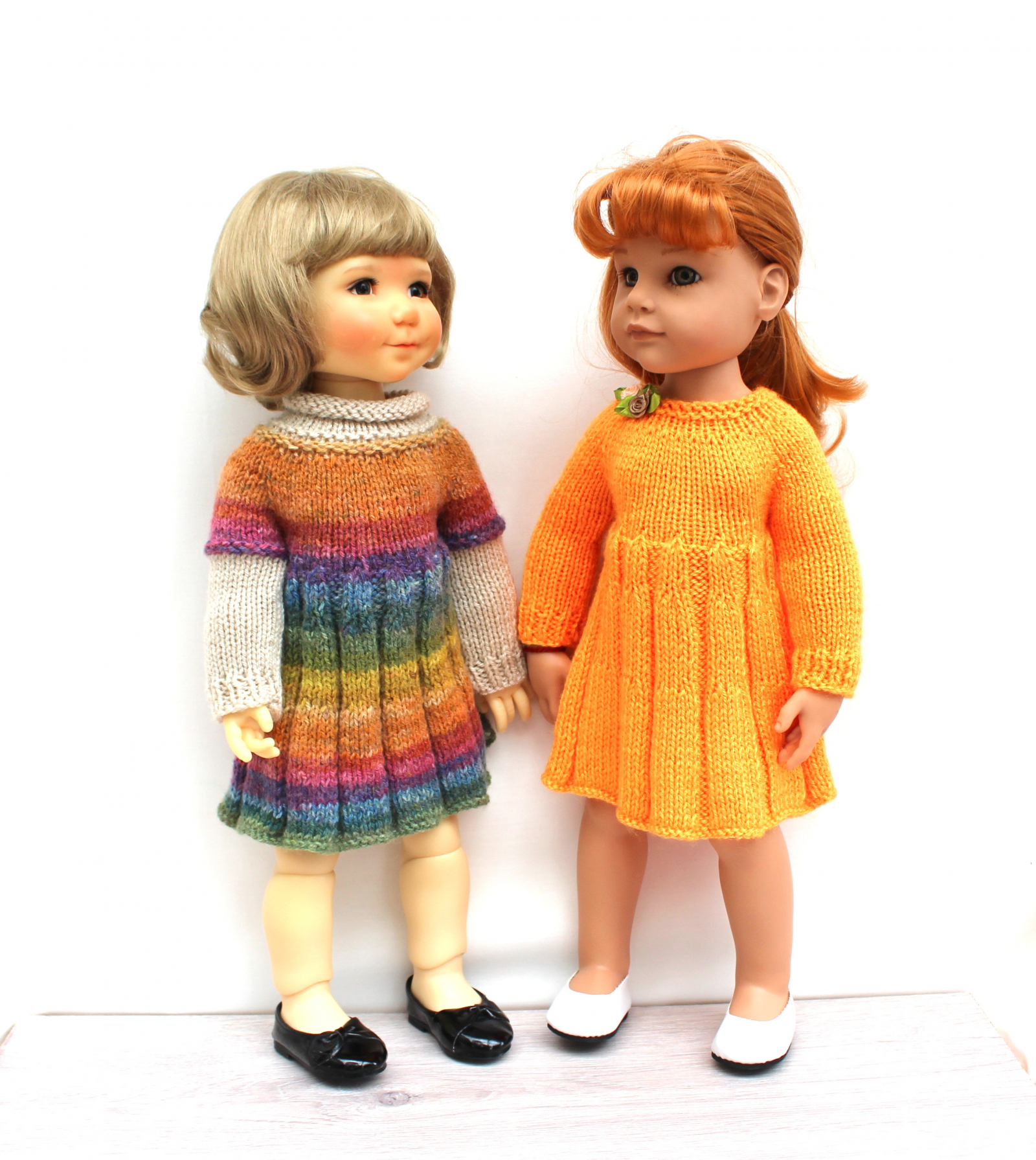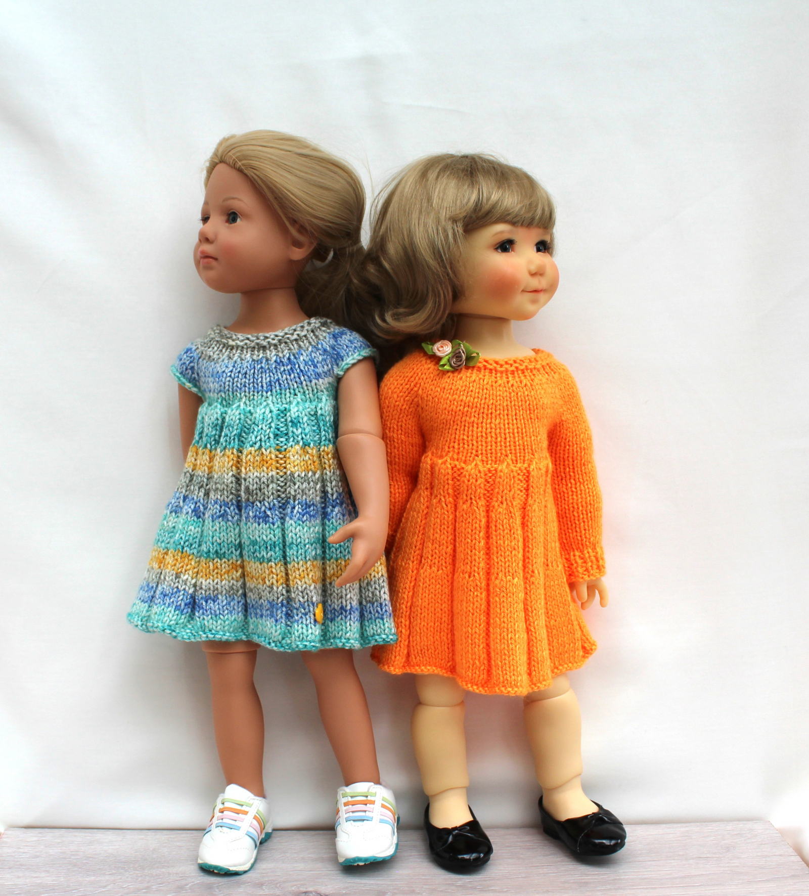 This knitting pattern includes 12 pages of row by row instruction for knitting three cute dresses for 18-inch slim dolls like Meadowdolls Big Bailey, Gotz Hanna, Happy Kids dolls and Journey Girls