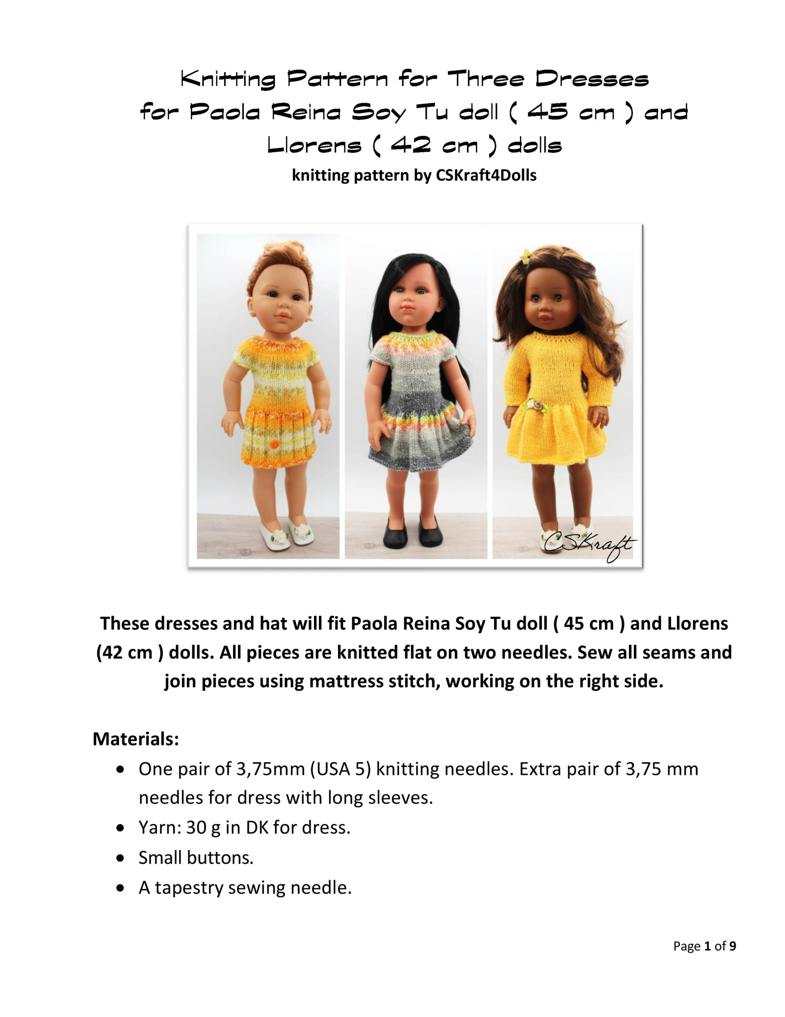 This knitting pattern includes 9 pages of row by row instruction for knitting three cute dresses for Paola Reina Soy Tu doll ( 45 cm ) and Llorens (42 cm ) dolls.